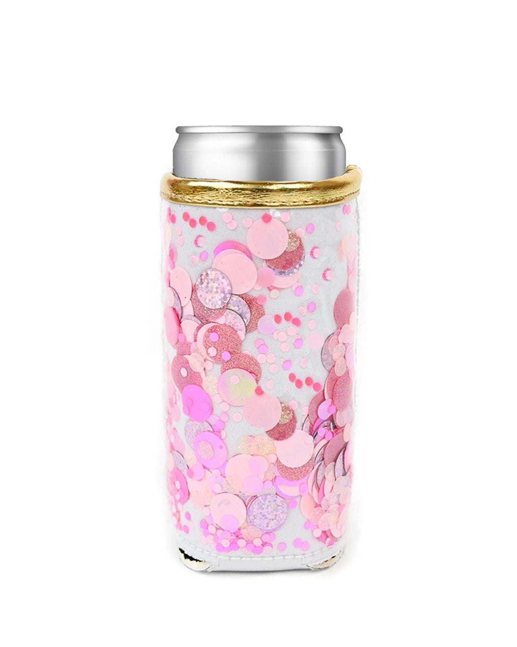 - Heavy duty clear vinyl slim insulated can koozie filled with confetti